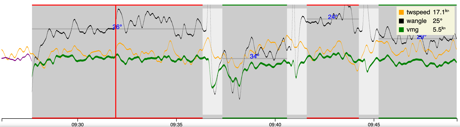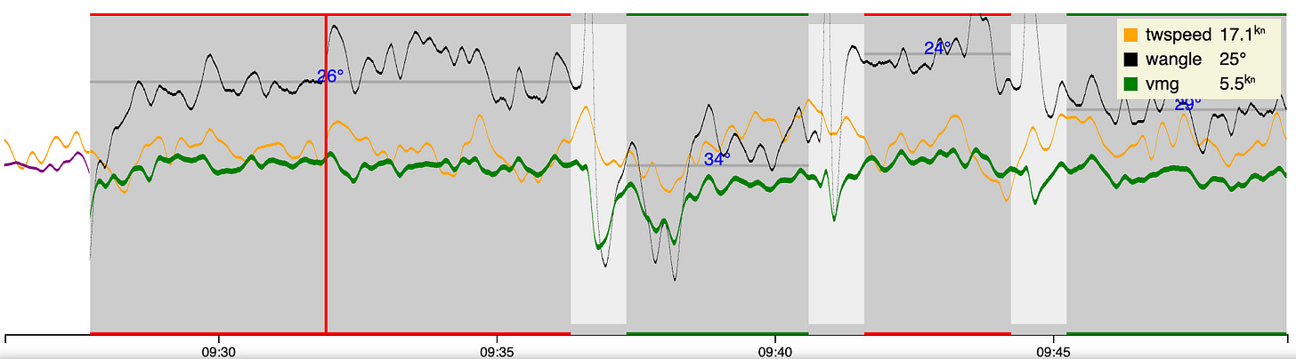 The helm’s a bit wobbly (we’re none of us perfect) but we can see that the port tacks are 26 and 24 degrees, and starboard is 34. Assuming the cars and sheets are set up identically we could make an argument for the wind sensor being twisted five degrees to port - causing starboard tacks to read five degrees higher and vice versa.